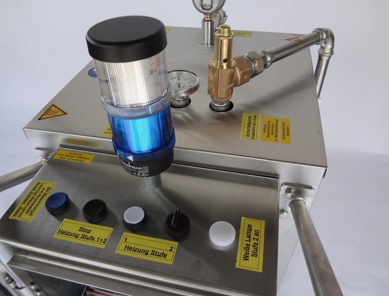 Mit dem Elektro-Dampferzeuger "Hans Dampf" können Sie Dampf erzeugen, um Rohrleitungen, Tanks, Kessel, Flaschenrinser, Flaschenfüller und Filter zu reinigen und zu sterilisieren, die mit der Getränke Förderung, Lagerung und Abfüllung in berührung kommen.